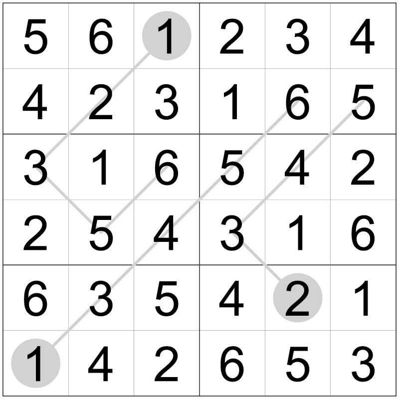 Her satırda, her sütunda ve kalın çizgilerle belirlenmiş her bölgede 1’den 6’ya tüm rakamlar tam olarak bir kez yer alacak şekilde diyagramı doldurun.