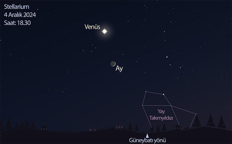 Venüs, aralık ayında Güneş’in batışından sonra güney- güneybatı yönünde, ufkun üzerinde ortaya çıkıyor ve yaklaşık üç saat sonra güneybatı-batı yönünde ufuktan batıyor. 4 Aralık akşamı Venüs’ü ve hilal şeklindeki Ay’ı, güneybatı yönünde ufkun üzerinde birbirine yakın görebilirsiniz. Ayın başında Venüs’ün gezegen yuvarlağının aydınlık görünen kısmının oranı %68 iken, ayın sonunda %56’ya iniyor. Siz de bir dürbün ya da küçük bir teleskop yardımıyla aralık ayında Venüs’ün evrelerindeki değişimi izleme fırsatını yakalayabilirsiniz.