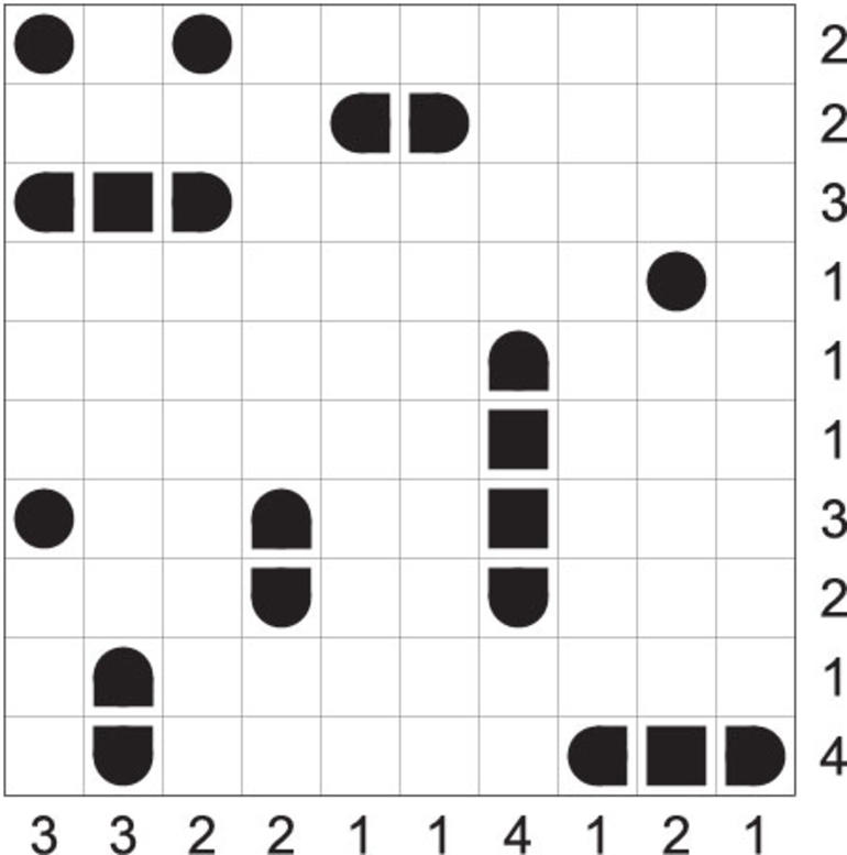 Her diyagrama 4 denizaltı, 3 destroyer, 2 kruvazör ve 1 savaş gemisini yatay ya da dikey öyle yerleştirin ki hiçbiri birbirine çaprazdan da olsa temas etmesin. Diyagramın dışındaki sayılar, o satır ya da sütunda bulunan gemi ve denizaltı parçalarının sayısıdır. Diyagramda bazı gemi ve denizaltı parçaları verilmiştir.