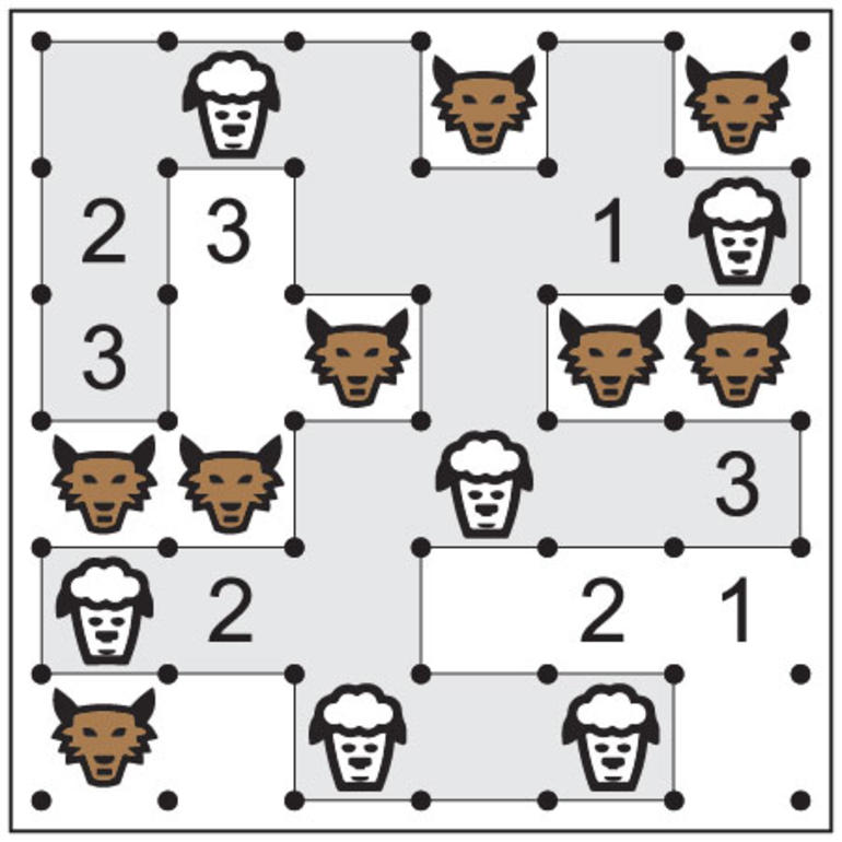 Çit oyununun bir türevi olan Kurtlar ve Kuzular oyununda amaç, noktaları yatay ve dikey çizgilerle birleştirerek kapalı tek bir çit oluşturmaktır. Rakamlar bulundukları hücrenin kaç kenarının çitin parçası olduğunu göstermektedir. Ayrıca tablodaki kurtlar çitin dışında, kuzular ise çitin içinde kalmalıdır.