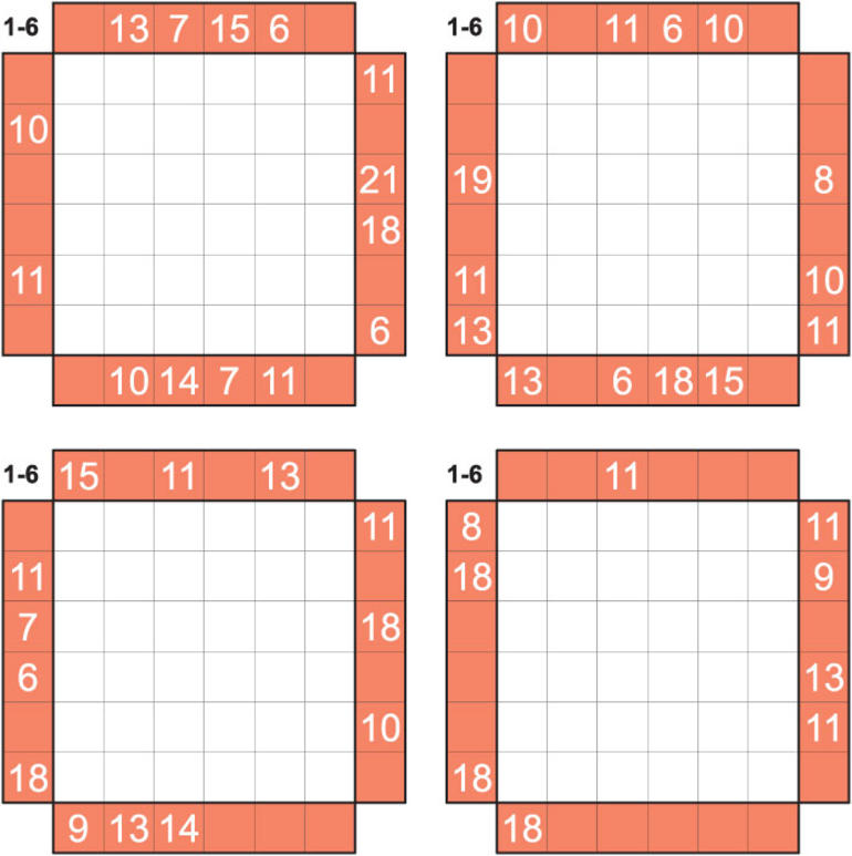 Apartmanların kat sayılarını belirten diyagramların sol üst köşelerinde verilmiş aralıktaki rakamları her satıra ve sütuna birer kez yerleştirin.