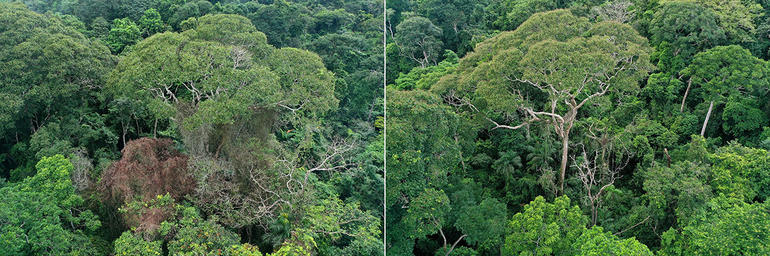 Dipteryx oleifera türü bir ağacın 2019’daki yıldırım çarpmasının ardından (solda) ve iki yıl sonra (sağda) çekilmiş fotoğrafları. Fotoğraflarda tropik ağacın (ortada) yıldırım çarpmasını önemli bir hasar almadan atlattığı görülüyor. Ayrıca iki görüntü karşılaştırıldığında yıldırım çarpmasından sonra ağacın etrafındaki diğer ağaçların ve ağacın üzerinde yaşayan asalak sarmaşıkların büyük oranda yok olduğu, böylece yıldırım çarpan ağacın daha fazla besin, su ve ışığa erişebildiği görülüyor.