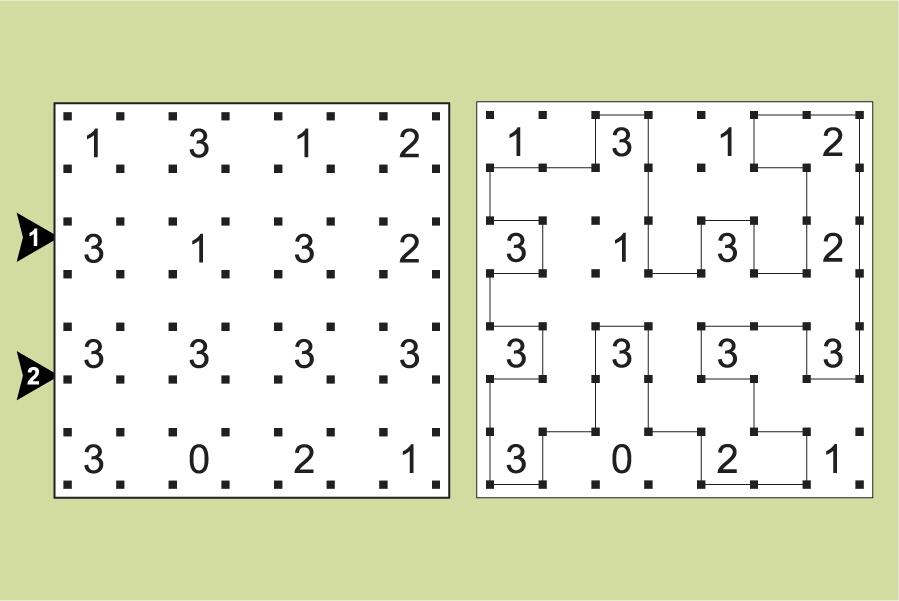 Noktaları yatay veya dikey çizgilerle birleştirerek kapalı tek bir çit oluşturun. Rakamlar bulundukları hücrenin kaç kenarında çit parçası olduğunu göstermektedir.