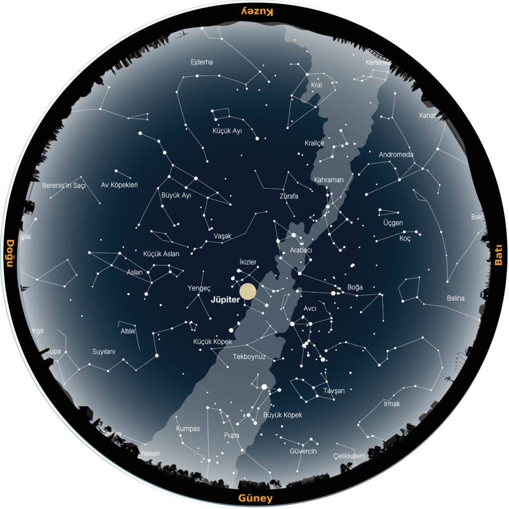 Jüpiter, şubat ayında neredeyse bütün gece gökyüzünde görülebiliyor. Ayın ilk günlerinde Güneş’in batışından sonra doğu yönünde ufkun üzerinde görülebilen Jüpiter, Güneş’in doğuşundan yaklaşık bir saat önce batı-kuzeybatı yönünde ufuktan batıyor. İlerleyen günlerde daha erken saatlerde batmaya başlayan Jüpiter’in parlaklığı ve görünür büyüklüğü hafifçe azalıyor.