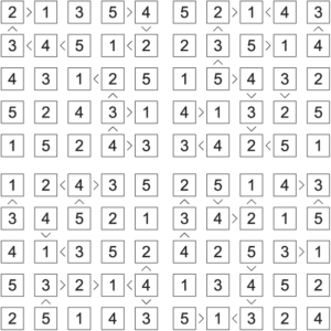 Her satırda ve sütunda 1’den 5’e (örnek için 1’den 4’e) kadar rakamlar tam olarak bir kez yer alacak şekilde diyagramı doldurun.